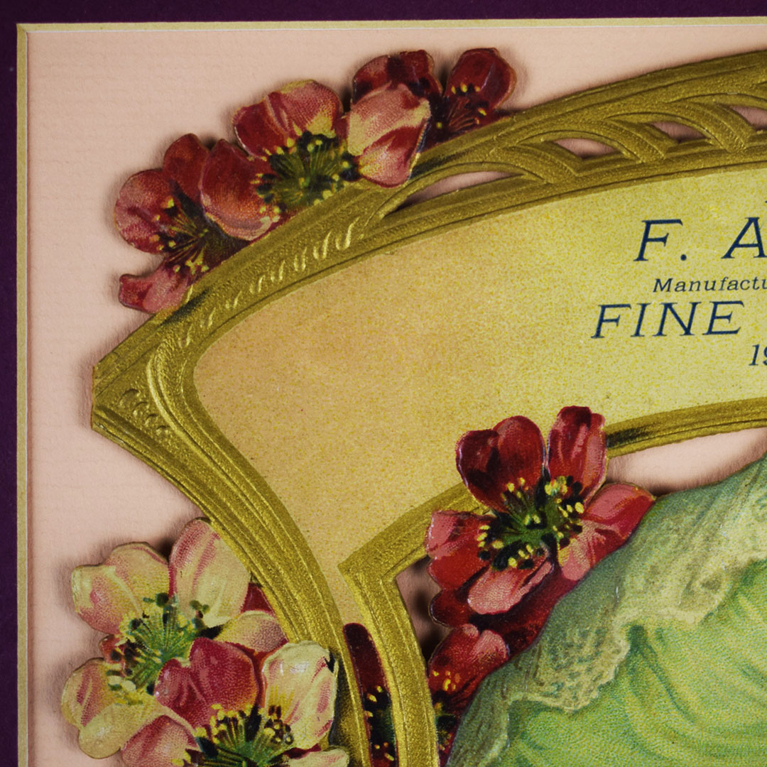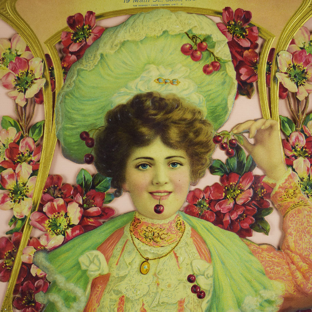 Produced by the Kemper-Thomas Company in Cincinnati, OH., this rare die-cut embossed cardboard calendar dates from the late 19th or early 20th century. It is decorated with an image of a beautiful Victorian lady, surrounded by cherry blossoms and art nouveau-style gilded trim, with a cherry hanging by its stem from her mouth. At the top, it is inscribed “Compliments Of F. A. Burnham Manufacturer and Wholesale and Retail Dealer in Fine Confectionery, 19 Main St., Saco, Me.” The advertising cardboard measures about 13 1/4 inches tall by 10 inches wide and is in excellent condition with minor edge wear. It has been matted and framed for display and protection. 17010-71RPP