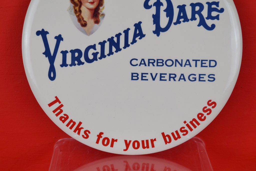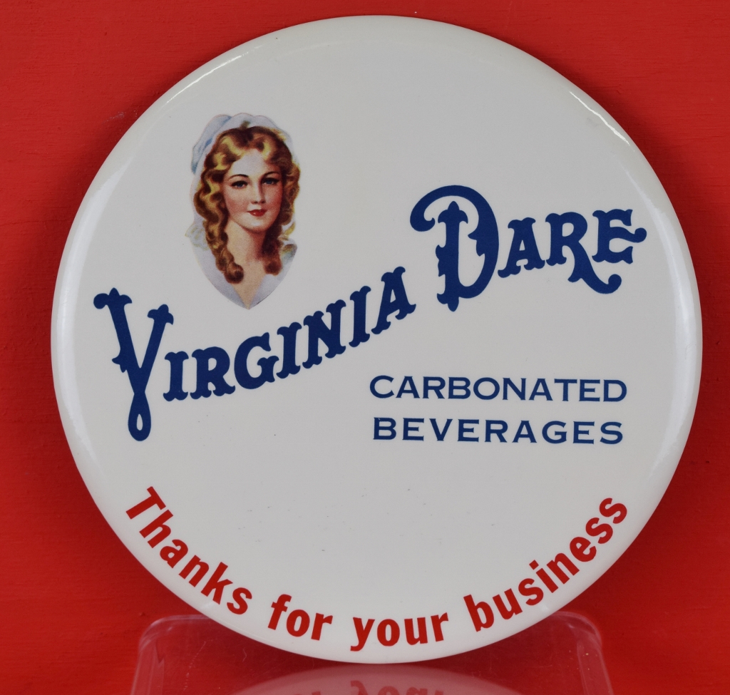 Produced by Philadelphia Badge Co., Inc. this super nice Virginia Dare Carbonated Beverages celluloid button is in amazing shape and appears unused. The gloss on the front is very nice and free of scratches and damage. On the reverse the original string is still there and the easel back appears still sealed. At the bottom it is beginning to separate, but is complete. It measures nine inches top to bottom and side to side. Don’t miss this beauty! 20027-WPP
