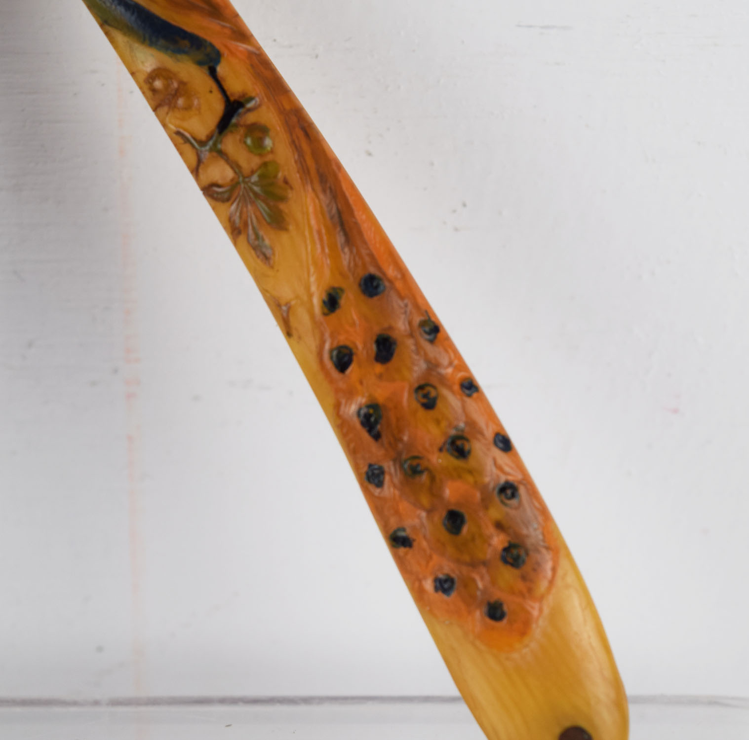 Most straight razors used in barber shops were very plain with very simple handles, so when we came across this one, we knew it was special! The celluloid handle has a raised peacock on it complete with amazing colors. A few very small cracks can be seen on the handle, as the celluloid is very fragile. The straight razor is marked “ERN” on one side and “1748” with “Wald – Germany” on the other. Super cool find with great colors ready for display! 19409-PP