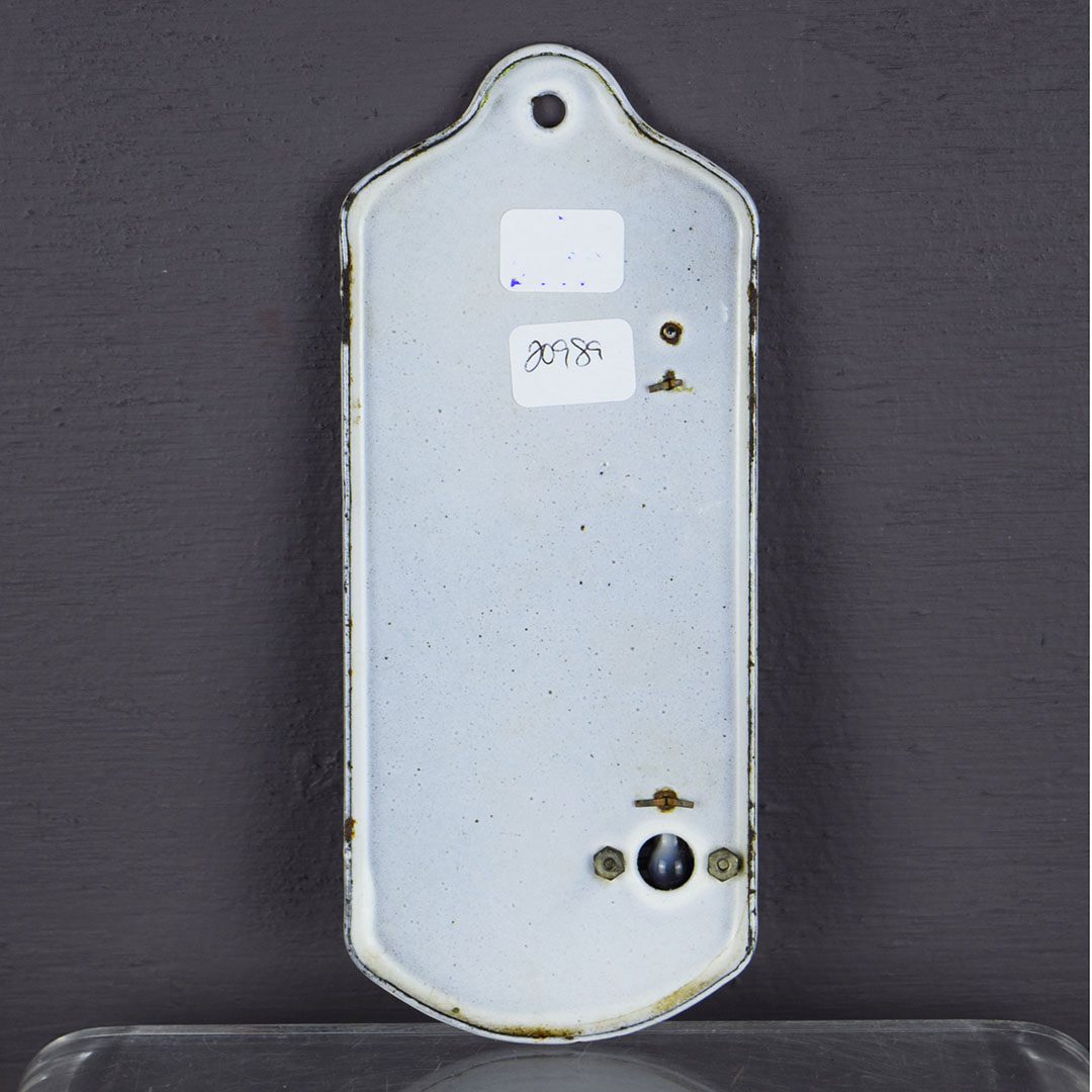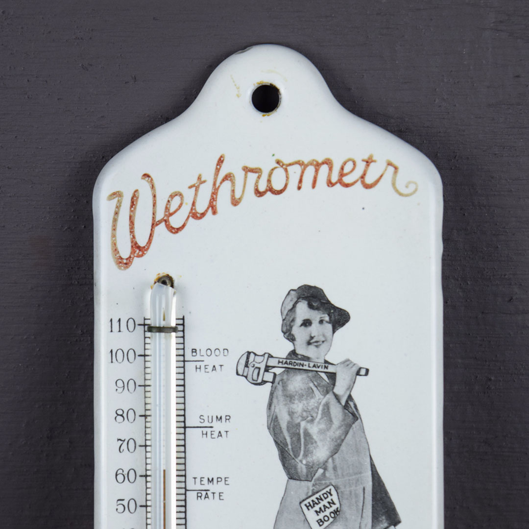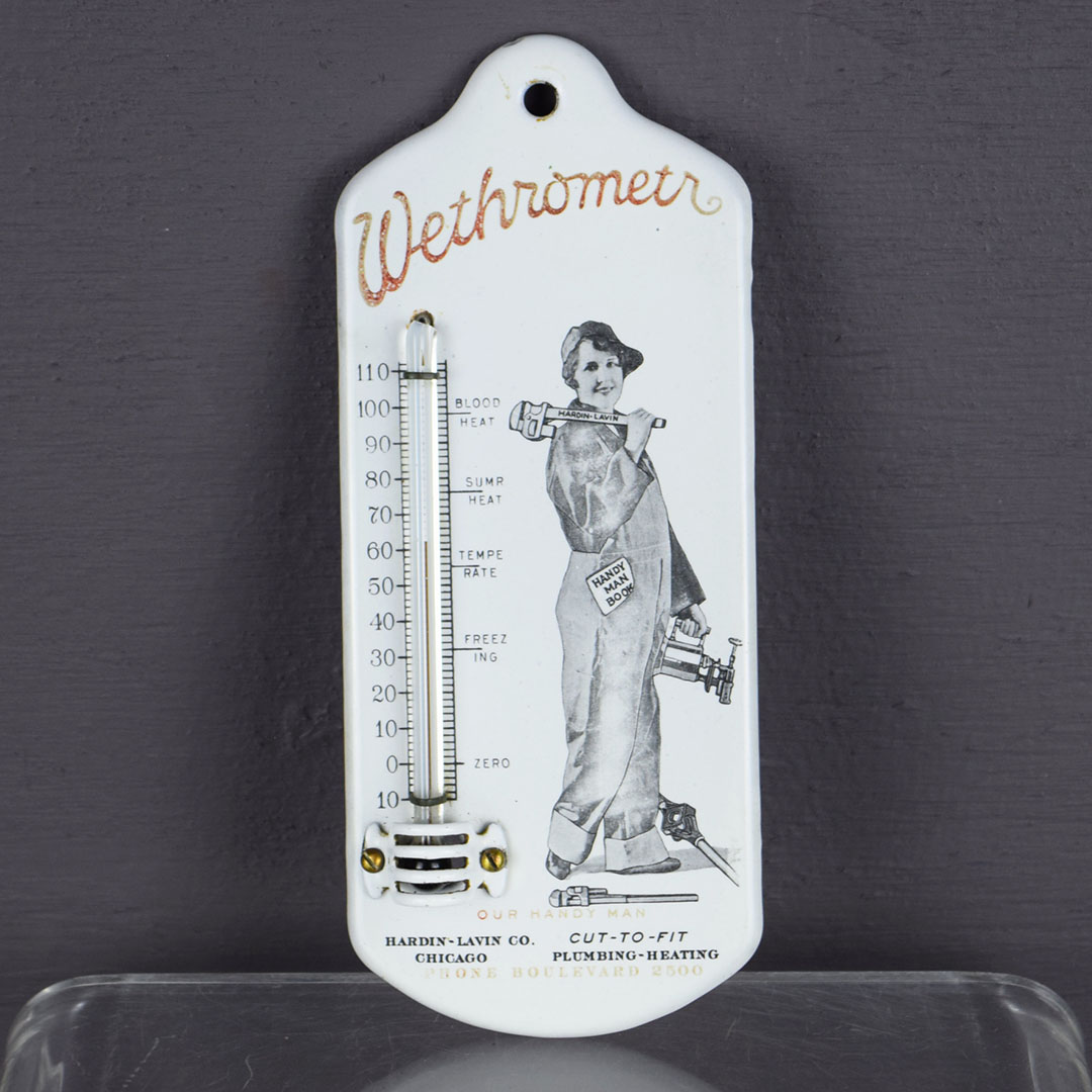 Wow, this stunning antique WETHROMETR enameled advertising thermometer from the Hardin-Lavin Co in Chicago, Illinois. It features a young woman in overalls with tools and a blowtorch. The Hardin Lavine Co. was an established heating and plumbing company that existed for several decades in the early 1900s. The caption beneath the cute mascot reads “Our Handy Man,” which may be a reference to the ladies who joined the labor force during WWI (1914 – 1918) as men served overseas. The graphics are crisp. The glass thermometer is undamaged and works but reads cooler than the actual temperature. A small vented metal cage covers the bulb, with a small hole at the top for wall hanging. There is a small chip on the outer edge of the curved top, and it measures approximately 6 1/8″ x 2 1/2″. 20989-TPP