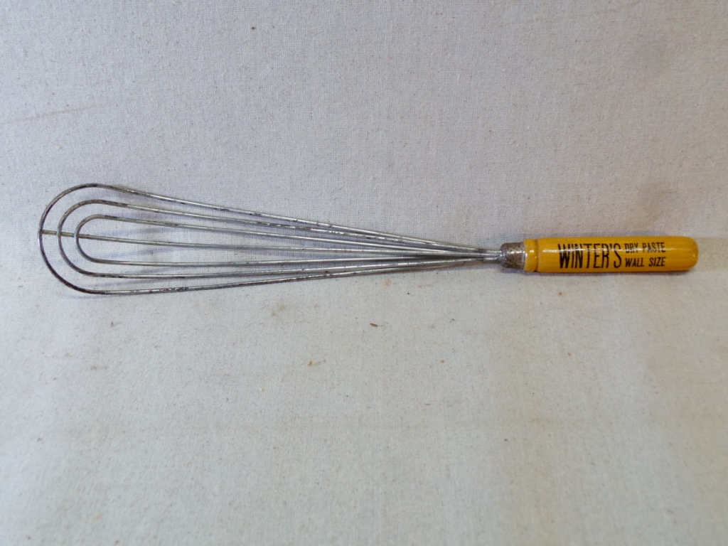 Dating from the 2nd quarter of the 20th century, this large whisk was most likely used at a commercial bakery originally. It has a soldered wire head and a wooden handle inscribed “Winter’s Dry Paste Wall Size I. B. Winter & Co. 2737 Fulton St., – Chicago, ILL.” The whisk measures 15 3/4 inches long by 2 5/8 inches wide and is in excellent condition with some light surface rust on the collar and finish crazing on the handle. 1379-QT