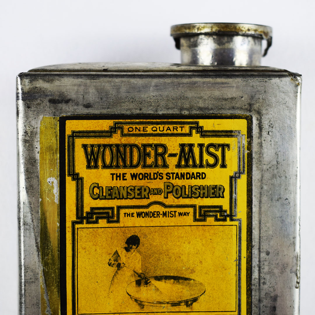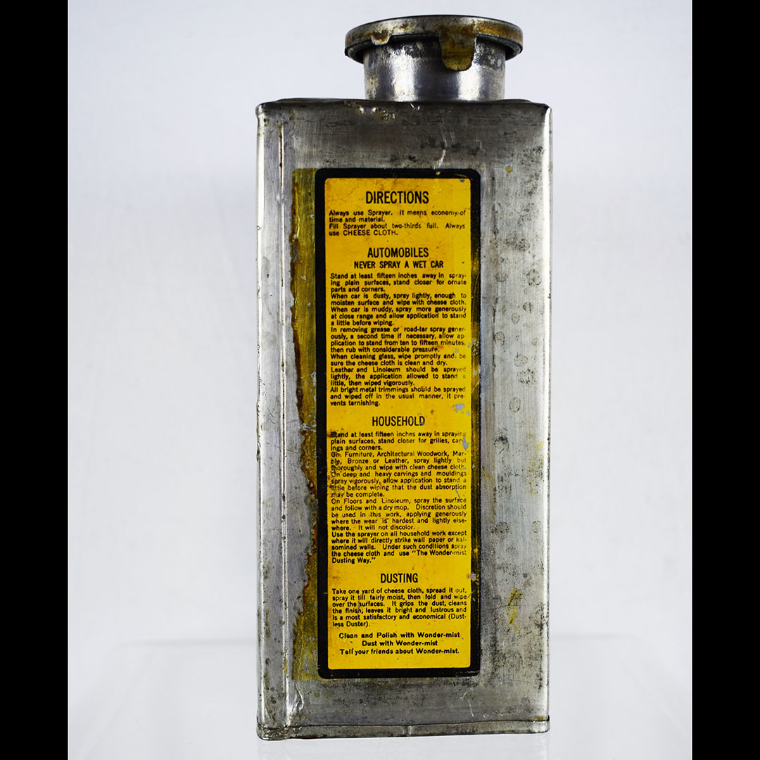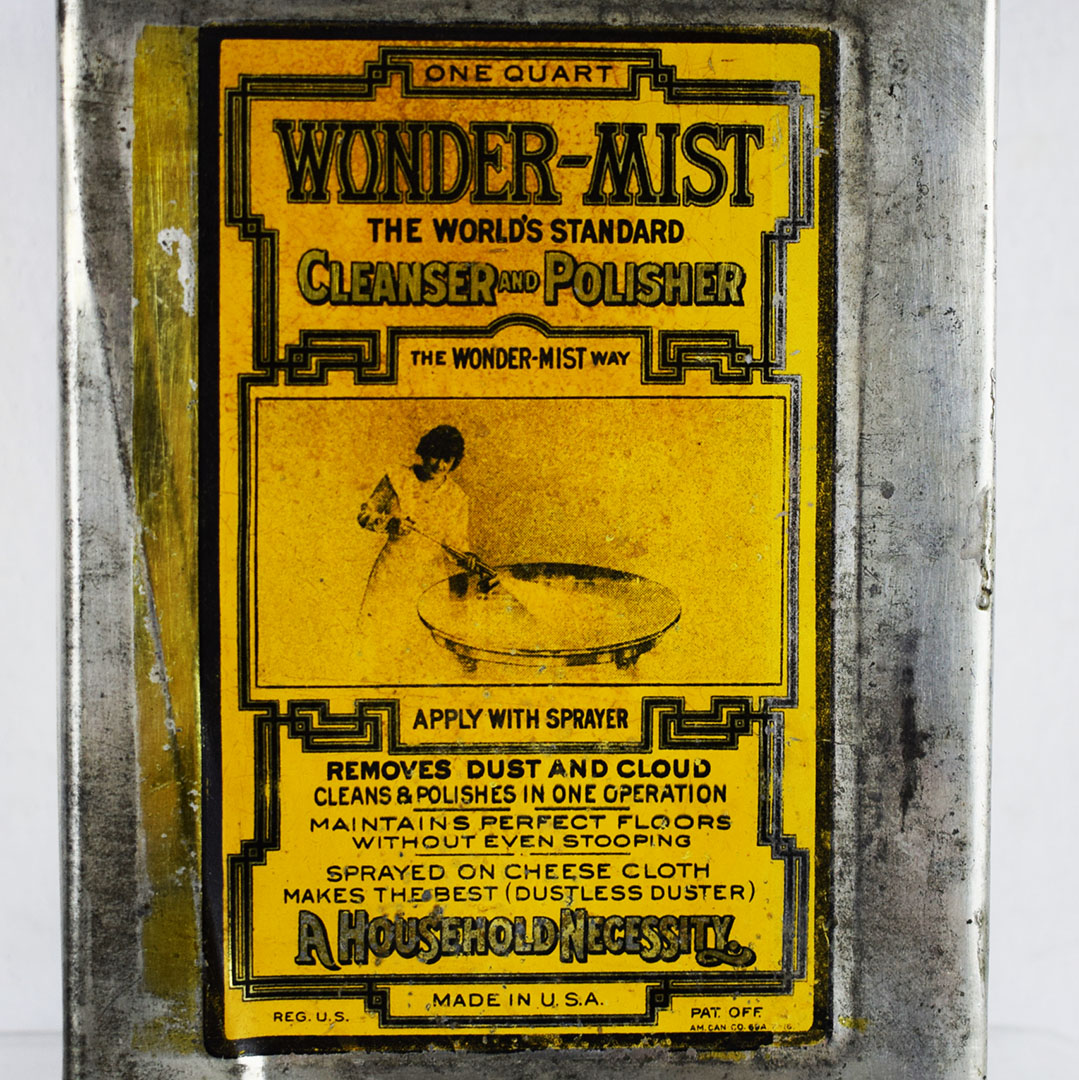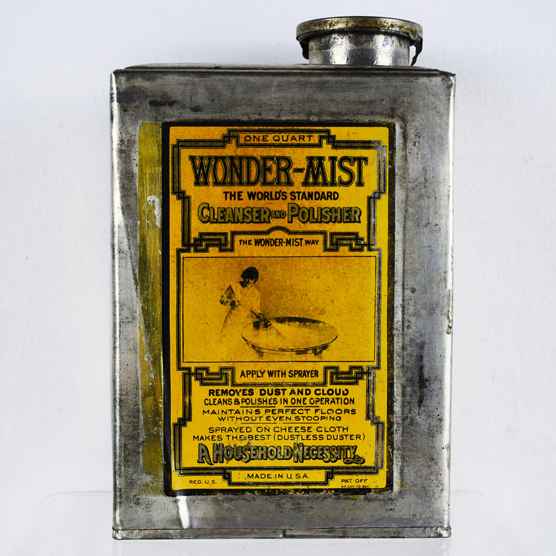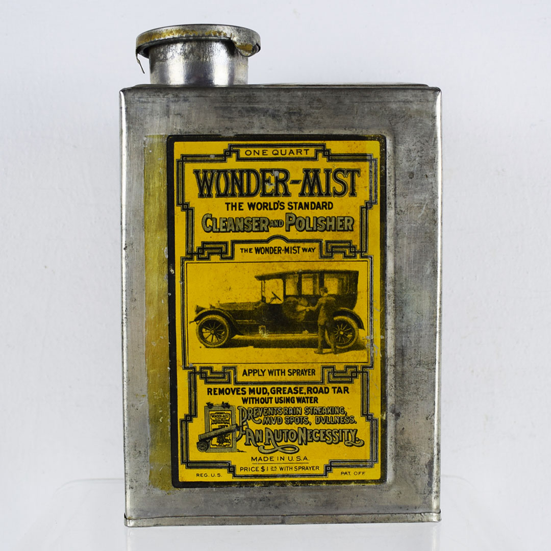 You need to look at this beautiful Wonder-Mist tin that just arrived! The one-quart Wonder-Mist can was necessary for automobiles as it was a cleanser and polisher that kept cars looking new. Featuring sharp graphics on each side, it shows an early 1900s automobile on the front and a lady cleaning on the back. Yes, this Wonder-Mist cleanser was also for household use! The tin can is in fantastic condition with typical wear but no holes or cracks. Plus, it retains the original cap, making this a unique find! The can measures 6.75 inches tall by 4.25 inches wide. 21143-WPP