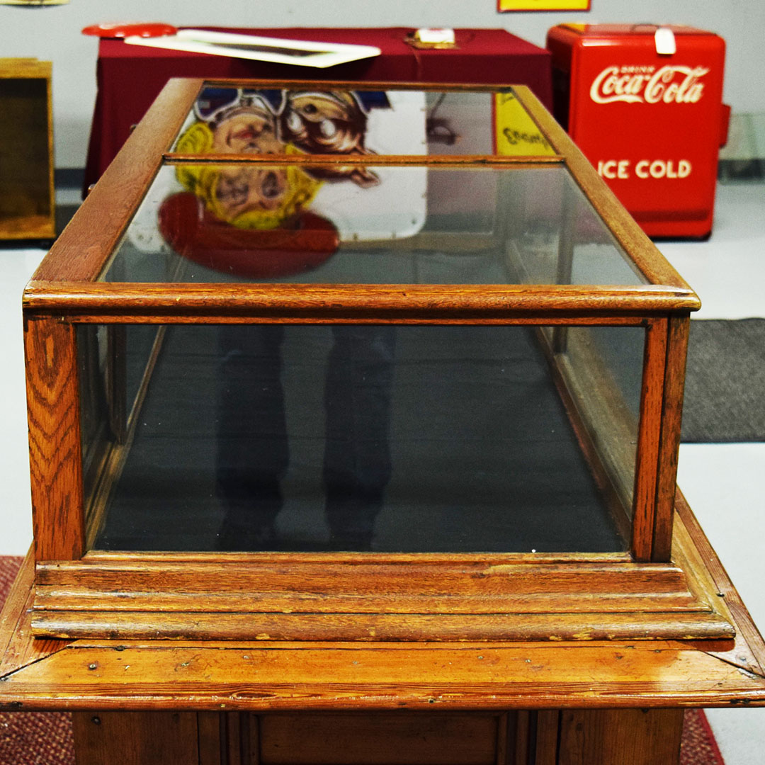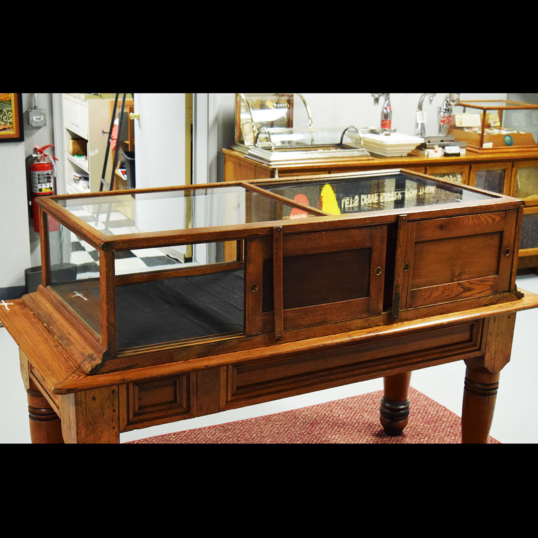This oak countertop showcase is the ideal size for displaying your best small items. Dating from the late 19th or early 20th century, It has three mirror-fronted sliding doors on the back and two glass panels on the top and front. The showcase measures 13 1/2 inches tall by 60 inches wide by 27 1/2 inches deep and is in excellent condition with an older refinish. The mirrors and 1 of the top glass panels are replacements. This incredible showcase sits on a beautiful four-leg table, which fits it nicely. Check out this out on Studebakers Site. Use the search at the top of the home page and put in: Heavy Pine Counter Store Turned Leg Table. Due to the size, this showcase is not a standard shippable item; it will require a third-party shipper. Of course, we love customers, so you can pick it up at our location and browse our two stores! 1439-WPP