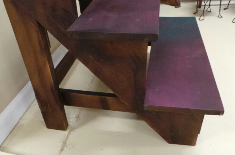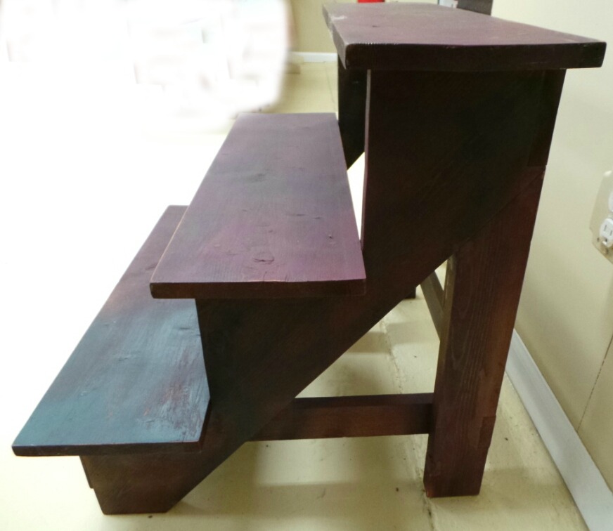 This small three step wooden shelf has a dark red mahogany finish that is almost purple. It measures 24 inches tall by 26 inches wide by 22 inches deep, and is in excellent condition with an area of dark green over spray on the bottom step. It is a great display for stoneware or oyster cans. 1259-81WE