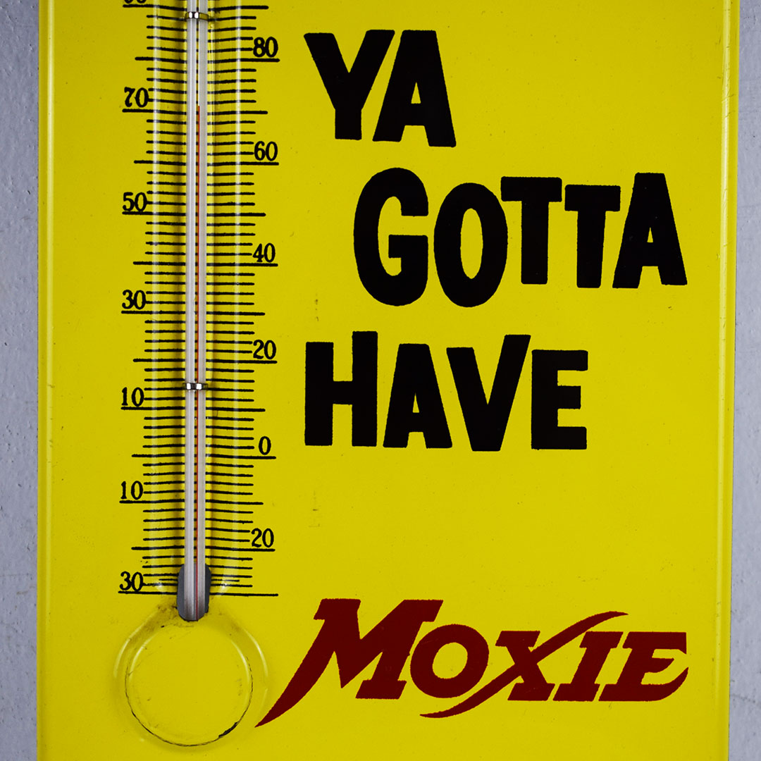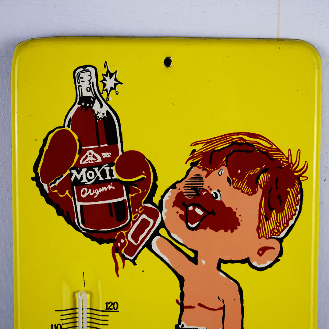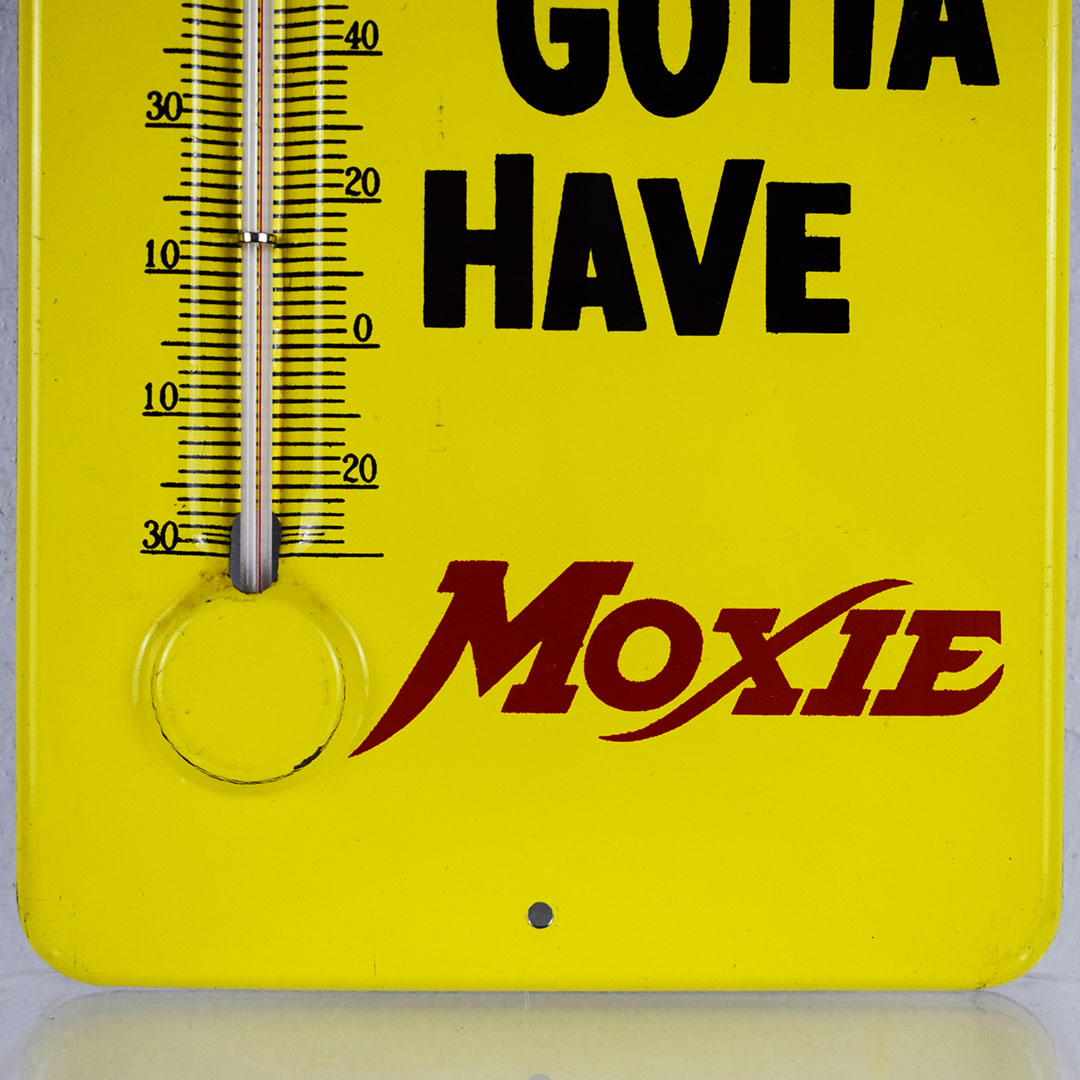 Bright colors and a cute slogan make this small tin thermometer a keeper! Derived from the soda, Moxie means energy, determination, spunk, daring courage, nerve, spirit, and guts. What better to put on a thermometer than a young boy wearing a boxing glove with a battered face? He definitely had guts in the boxing ring! “Ya Gotta Have Moxie” is the slogan that stands out nicely against the yellow background. Some chipping is on the rounded embossed area below the thermometer, and a slight bend is at the top mounting hole. It measures 13.5 inches tall by 5.75 inches wide with curled edges around the outside. The temperature reads correctly, and the thermometer tube appears original. 21287-EPP