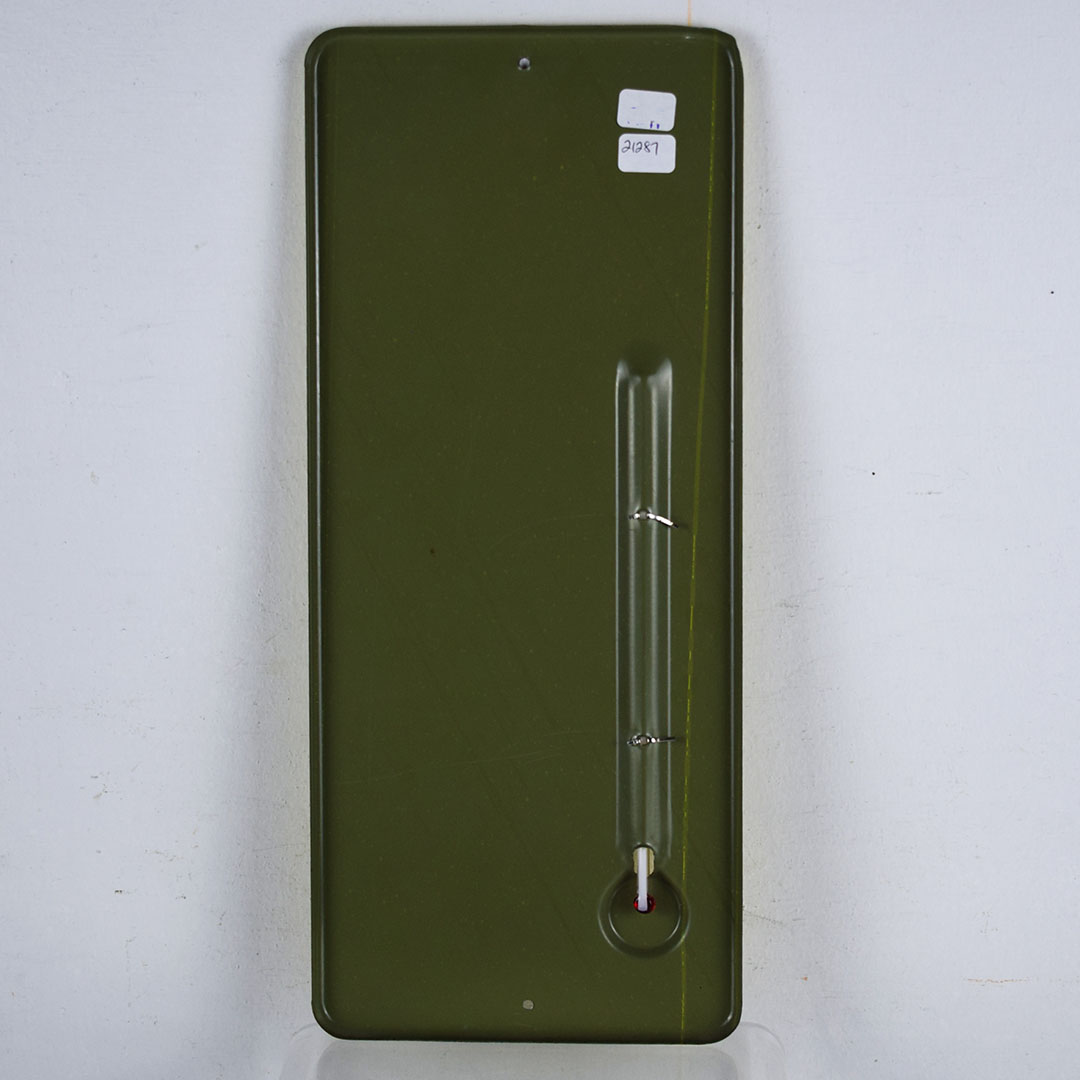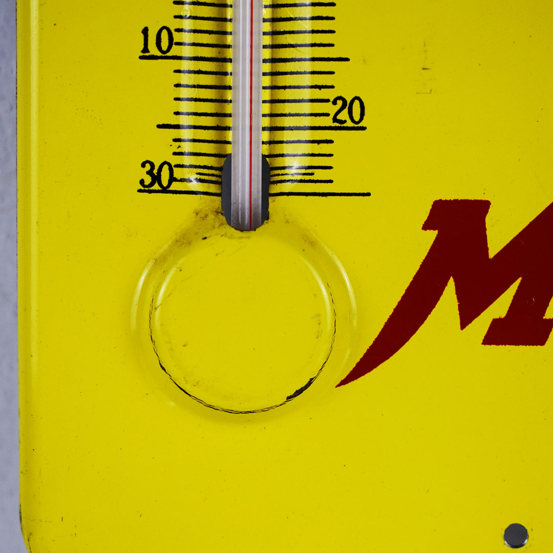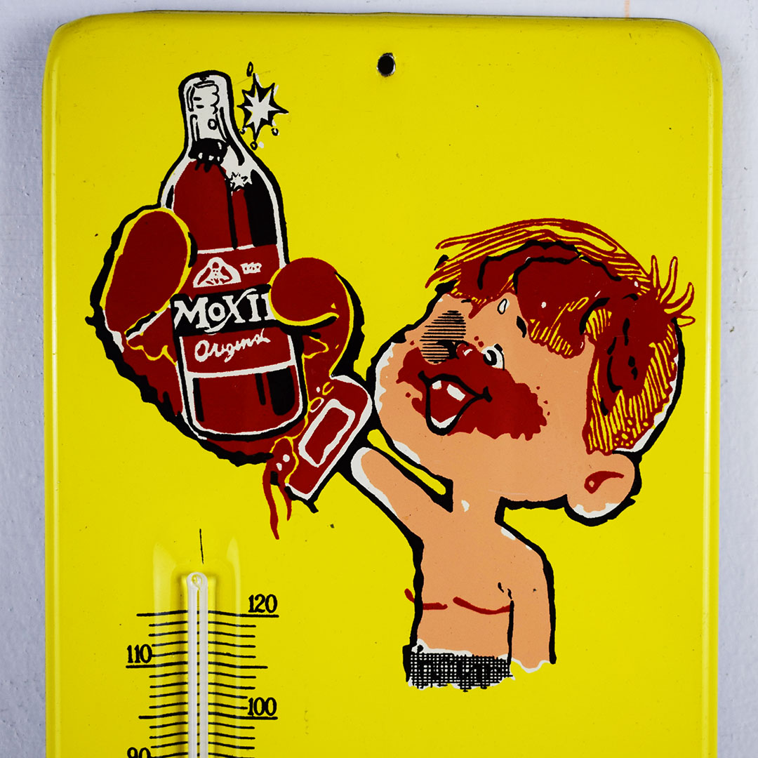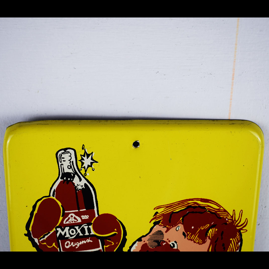 Bright colors and a cute slogan make this small tin thermometer a keeper! Derived from the soda, Moxie means energy, determination, spunk, daring courage, nerve, spirit, and guts. What better to put on a thermometer than a young boy wearing a boxing glove with a battered face? He definitely had guts in the boxing ring! “Ya Gotta Have Moxie” is the slogan that stands out nicely against the yellow background. Some chipping is on the rounded embossed area below the thermometer, and a slight bend is at the top mounting hole. It measures 13.5 inches tall by 5.75 inches wide with curled edges around the outside. The temperature reads correctly, and the thermometer tube appears original. 21287-EPP