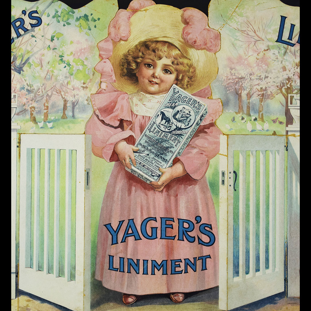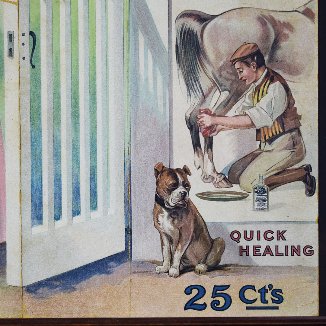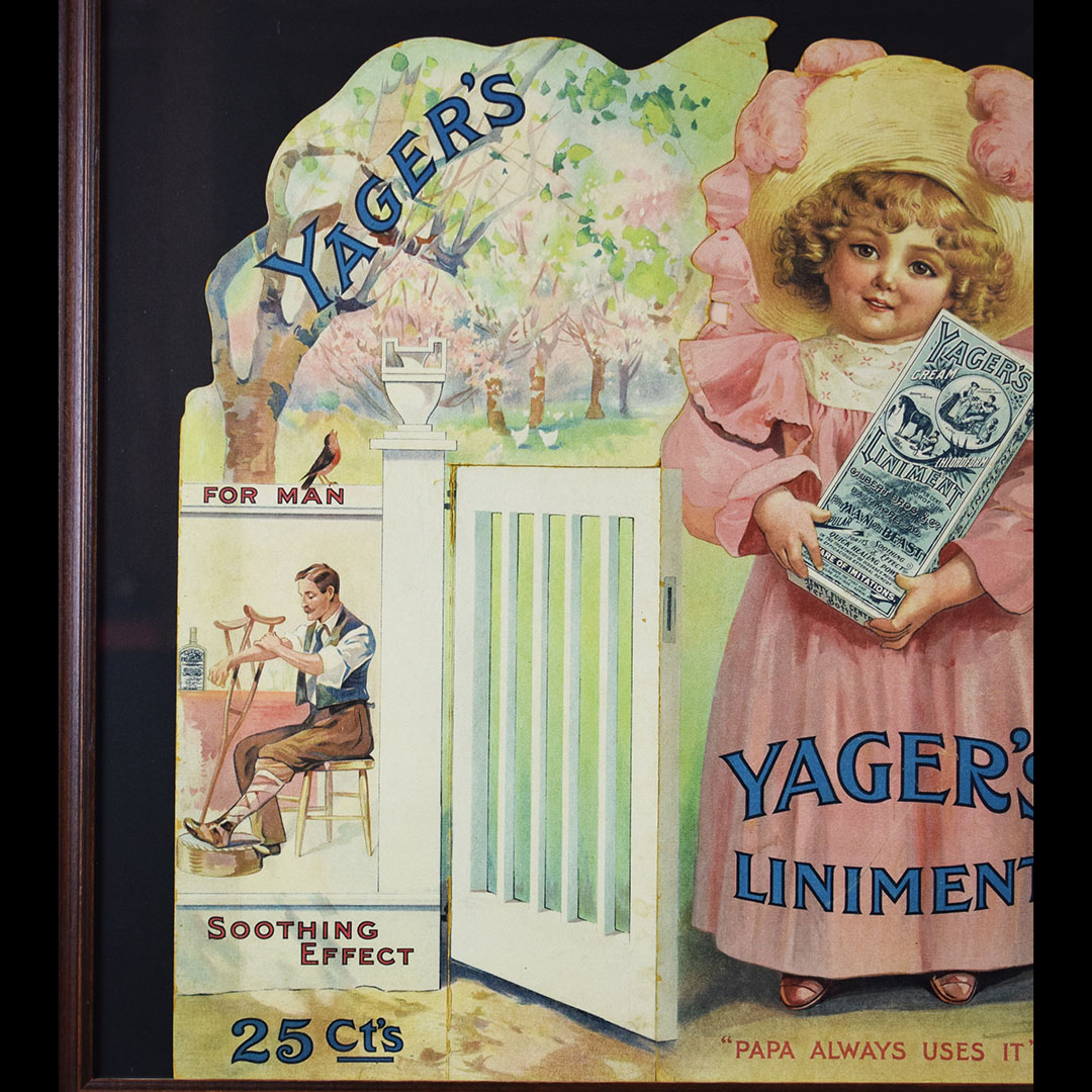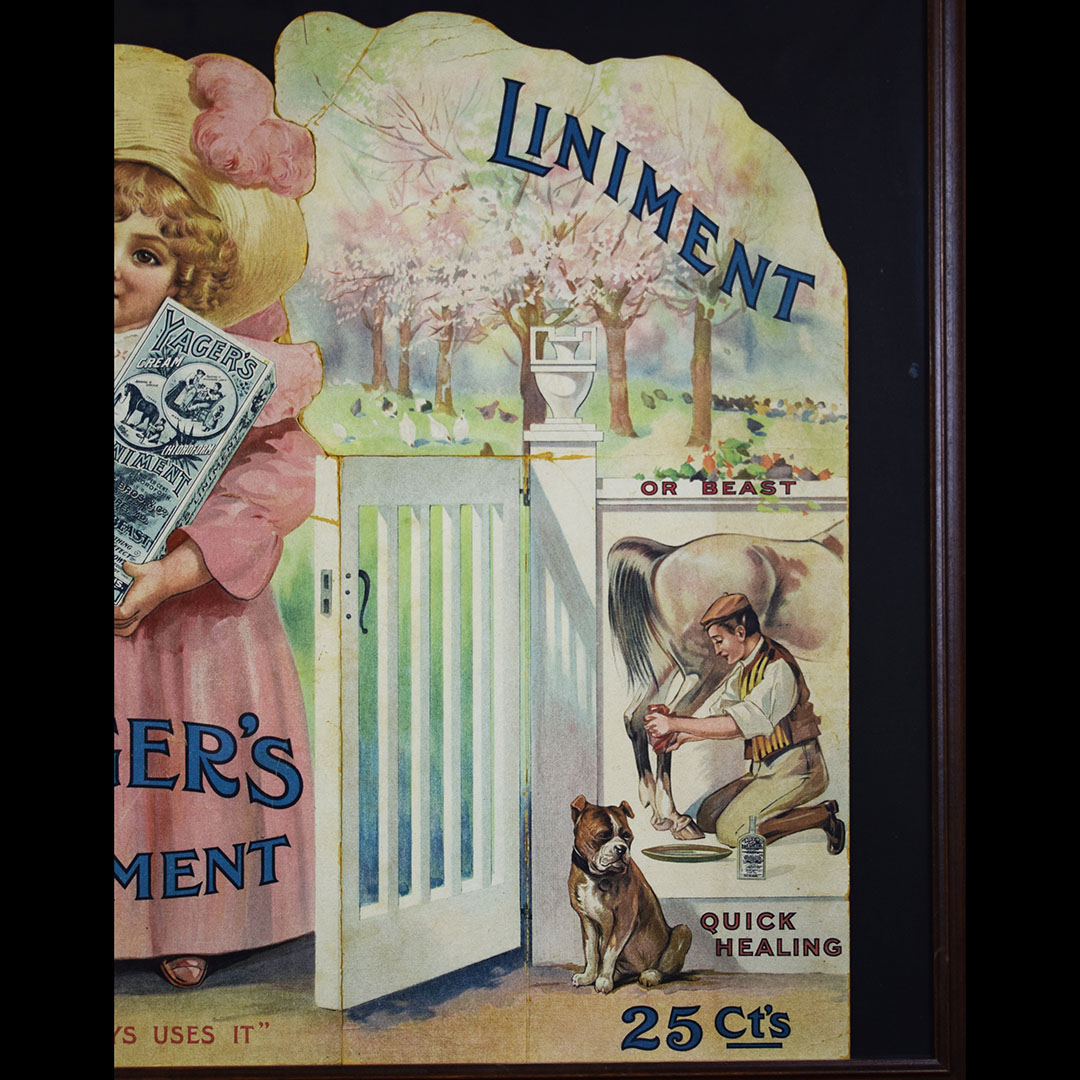 Advertised for both Man or Beast, Yager’s Cream Liniment multi-fold store window display is professionally framed and ready for your wall! The die-cut cardboard sign measures 28.5 inches in length by 21 inches in height. The centerpiece features a well-dressed young girl holding a large Yager’s Cream Liniment box with the phrase “Papa Always Uses It” at her feet. The left side features a gentleman with a wounded leg, and the right side features a horse caretaker using the creme. Some folds are along the top of this cardboard, with outer edgewear. The colors of this vintage piece, which dates from the early 1900s, are fantastic and eye-catching. 21123-RRP