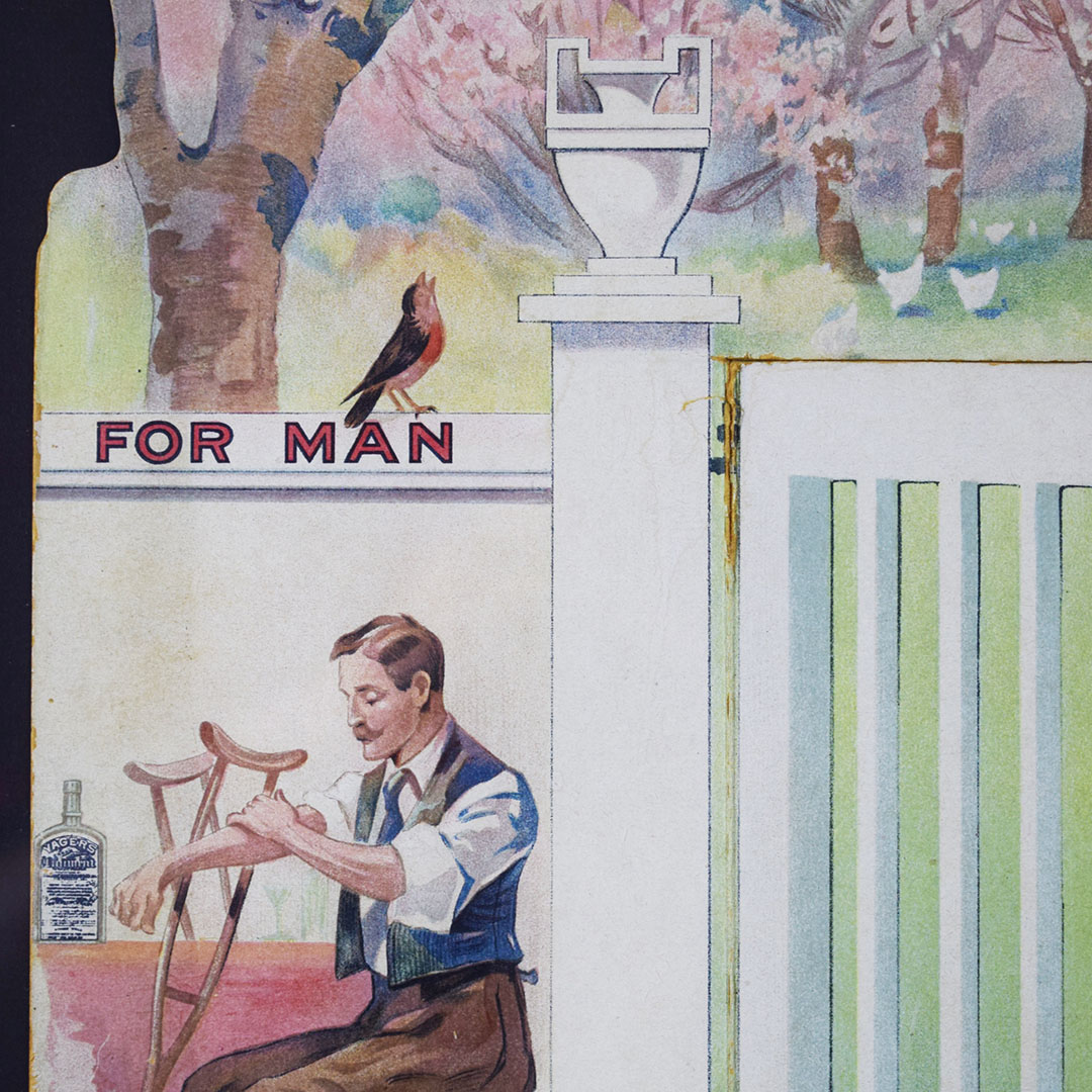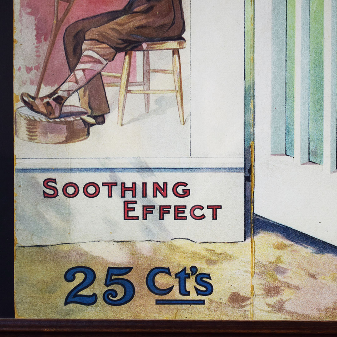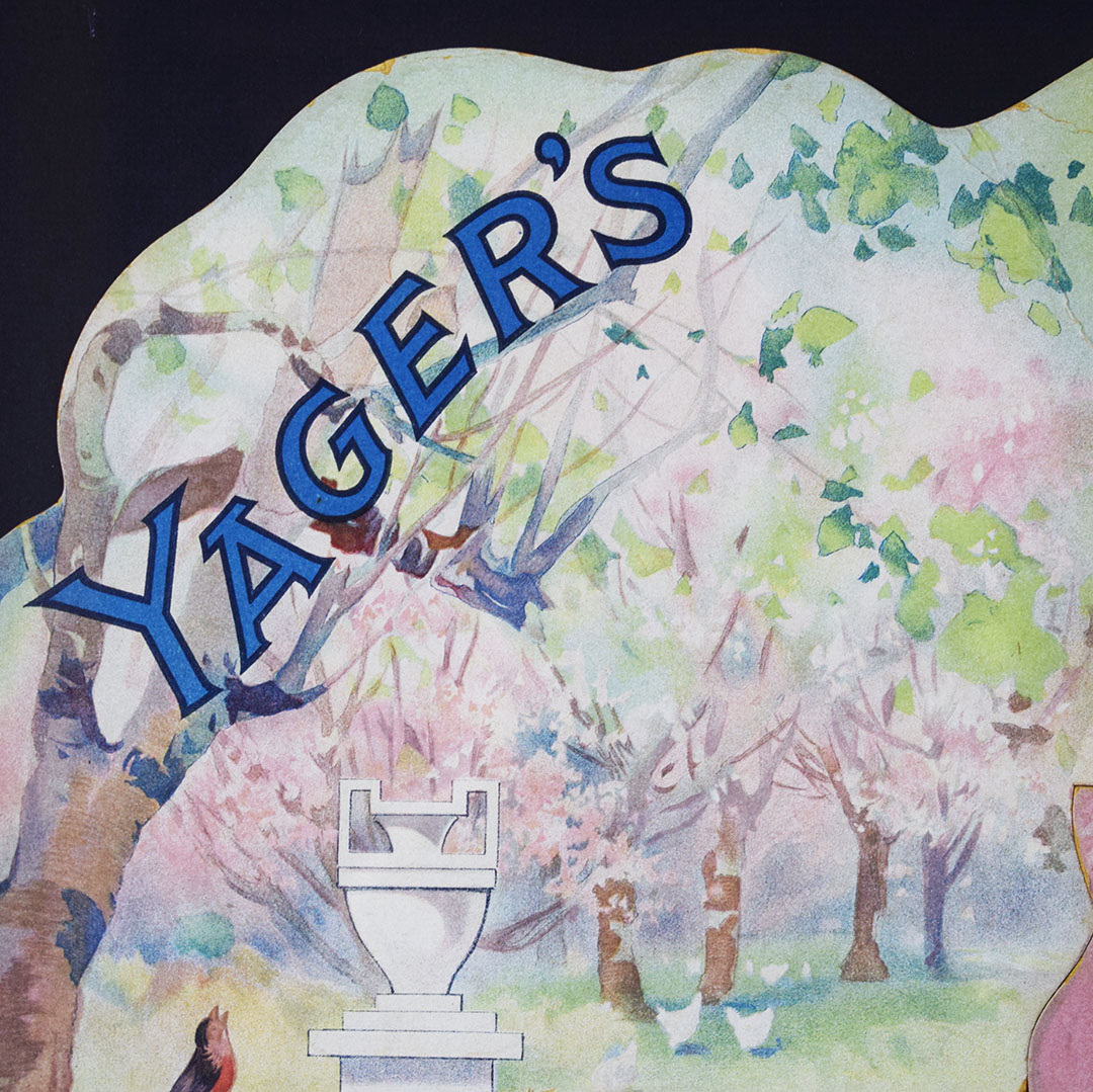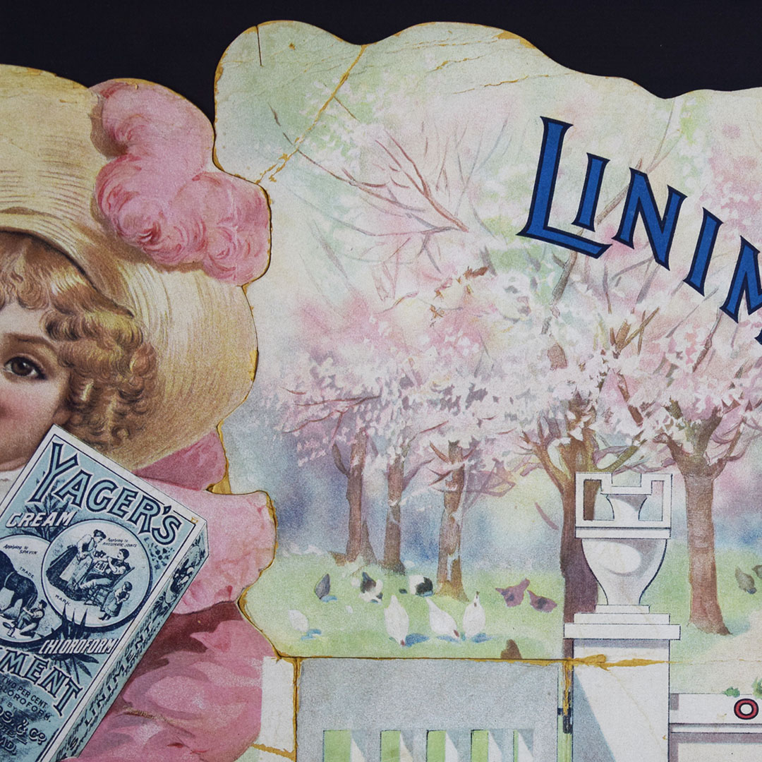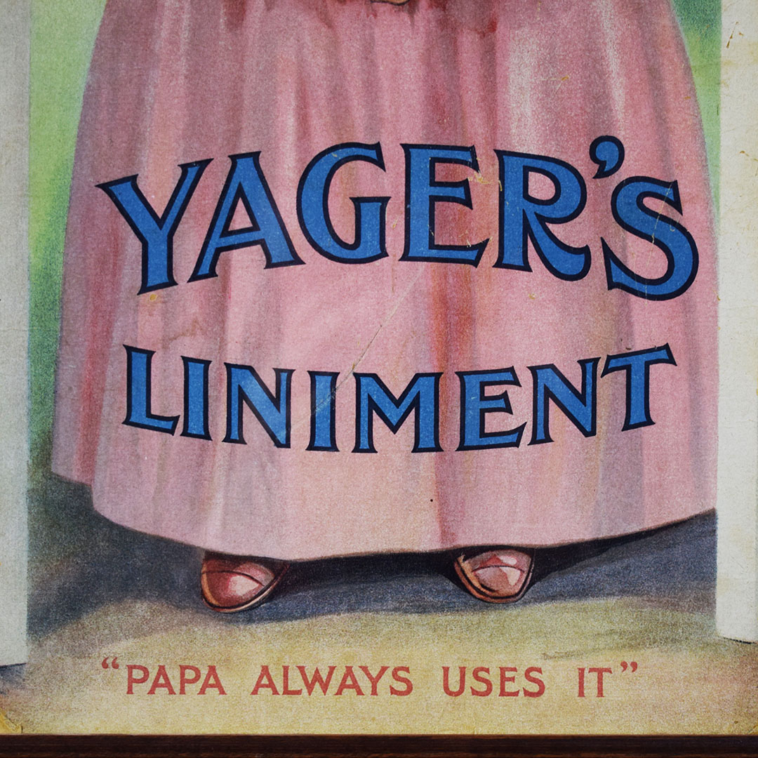 Advertised for both Man or Beast, Yager’s Cream Liniment multi-fold store window display is professionally framed and ready for your wall! The die-cut cardboard sign measures 28.5 inches in length by 21 inches in height. The centerpiece features a well-dressed young girl holding a large Yager’s Cream Liniment box with the phrase “Papa Always Uses It” at her feet. The left side features a gentleman with a wounded leg, and the right side features a horse caretaker using the creme. Some folds are along the top of this cardboard, with outer edgewear. The colors of this vintage piece, which dates from the early 1900s, are fantastic and eye-catching. 21123-RRP