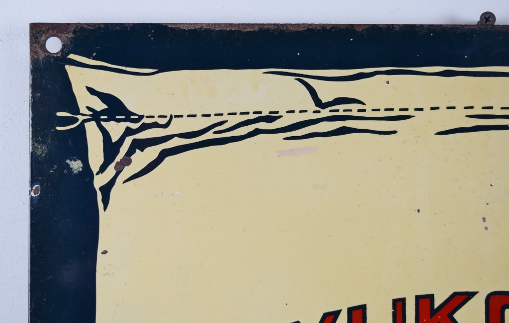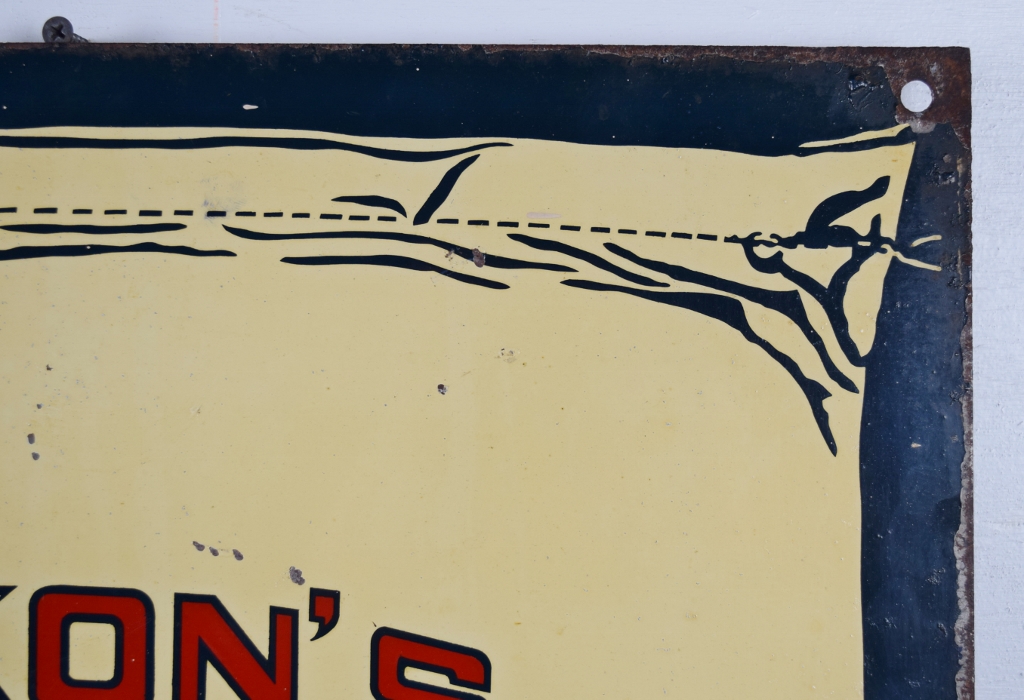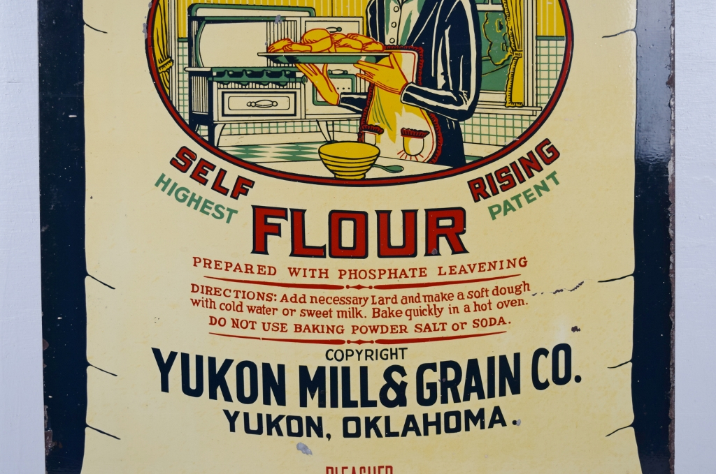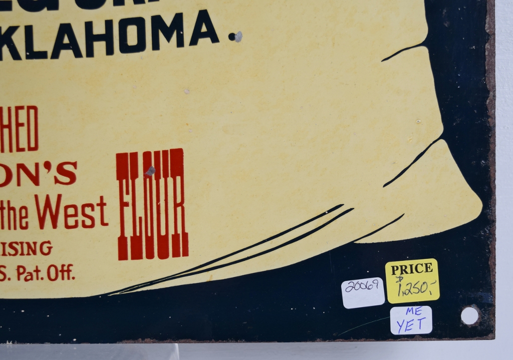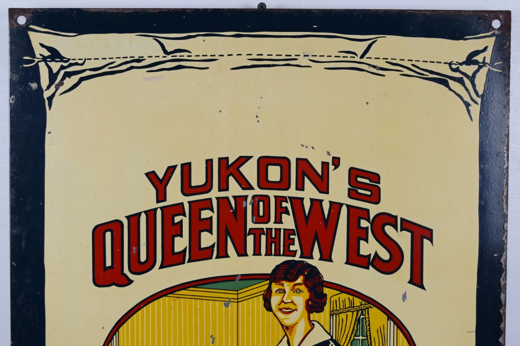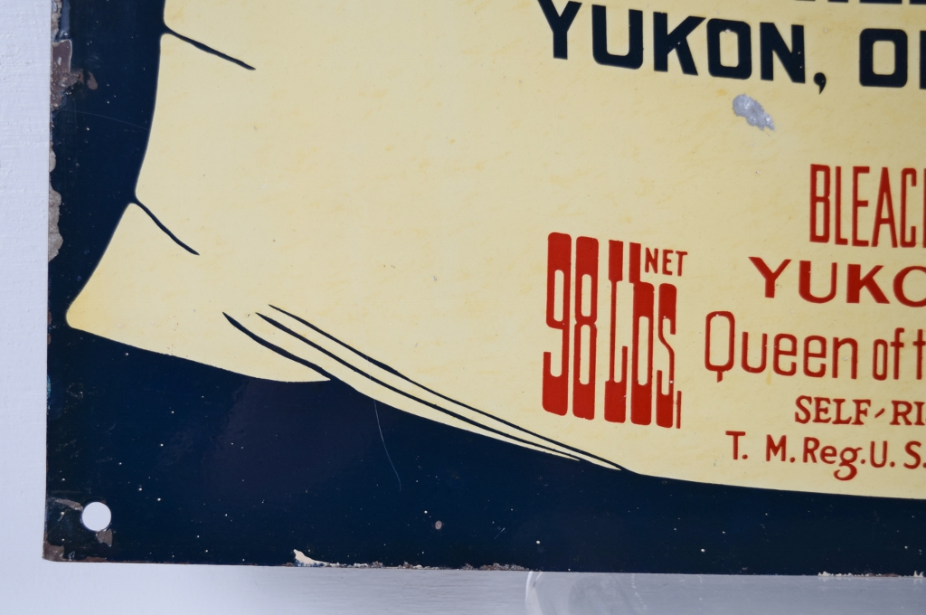 Just in and ready for your wall is this super rare Yukon’s Queen Of The West Flour lithograph sign. It measures thirty inches tall by eighteen inches wide and is beautifully designed. The colors really pop on the graphic face, and the gloss is great. The outer edges of the sign have typical chipping with some minor paint loss, with a few chips in the field. The lower left corner has a slight bend outward.Very rare and hard to find size that will make you fall in love. 20069-YET
